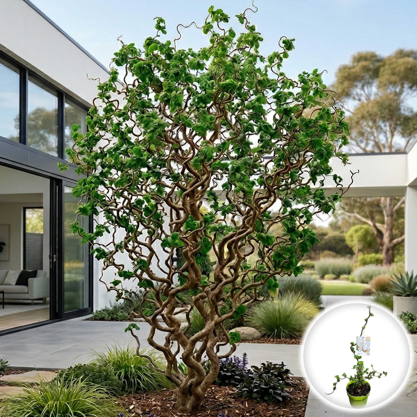 Prezentare: Arbust decorativ cu port sinuos, ramuri spiralate ("în tirbușon") spectaculoase în sezonul rece și frunziș texturat.