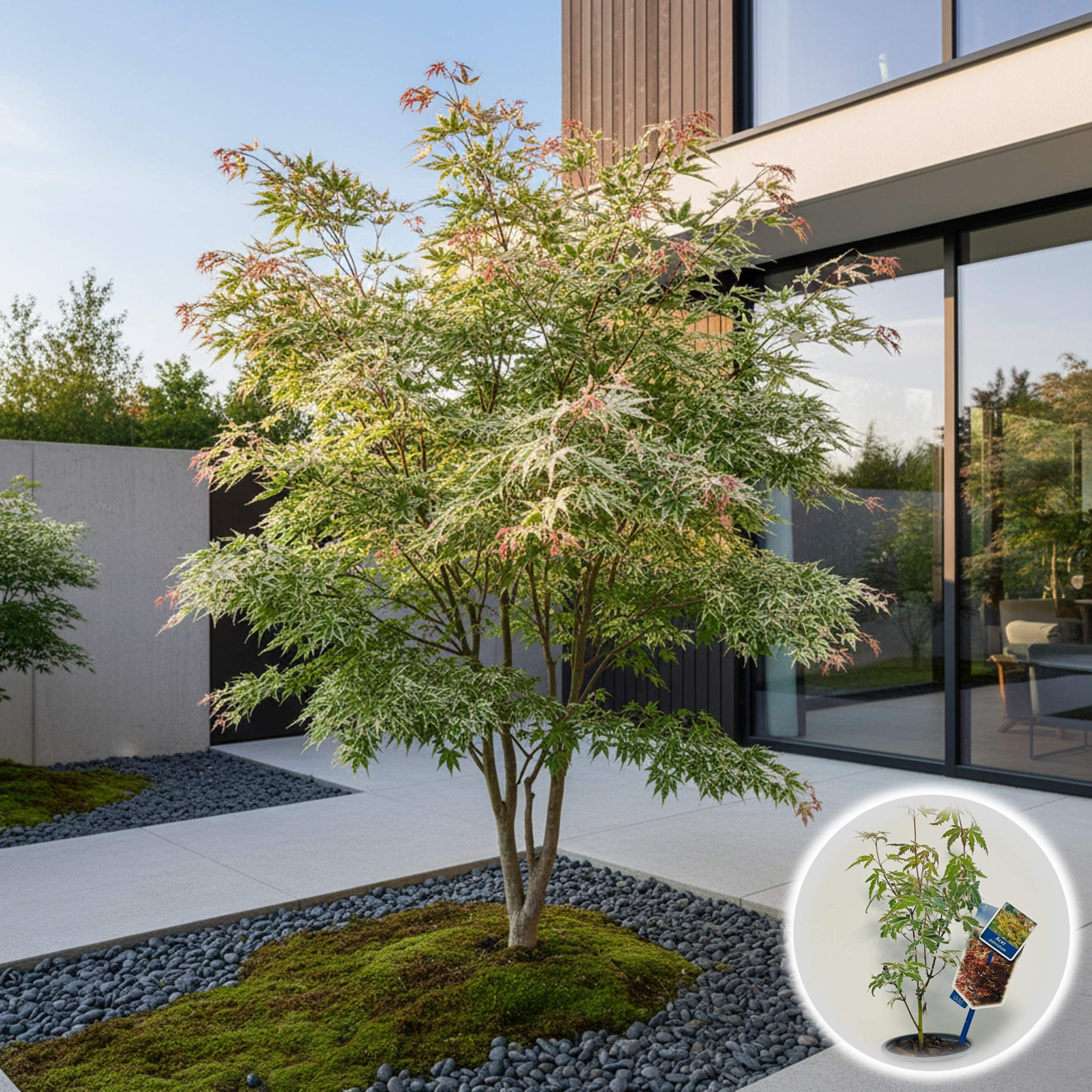 Descriere: 'Butterfly' este o varietate de arțar japonez cu un port vertical, dens și o creștere lentă. Este ideal pentru a fi plantat în exterior, în grădini, pe alei, în curți interioare sau în ghivece mari, pe terase și balcoane. Frunzișul său este principalul punct de atracție, având o formă de evantai cu 5-7 lobi, cu margini de un roz-crem delicat pe un fond de un verde-albăstrui deschis. Această combinație de culori creează un efect de „fluture” care se unduiește în vânt. Toamna, marginile frunzelor capătă nuanțe de roșu-aprins înainte de a cădea.