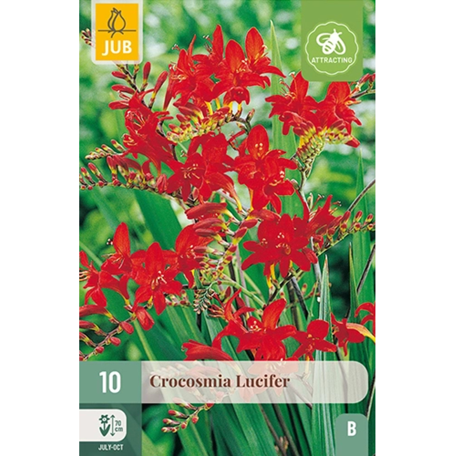 Crocosmia Lucifer este o varietate premiată, celebră pentru florile sale de un roșu pur, intens, care par să plutească pe tije elegante, fiind una dintre cele mai viguroase și înalte varietăți de Crocosmia.
