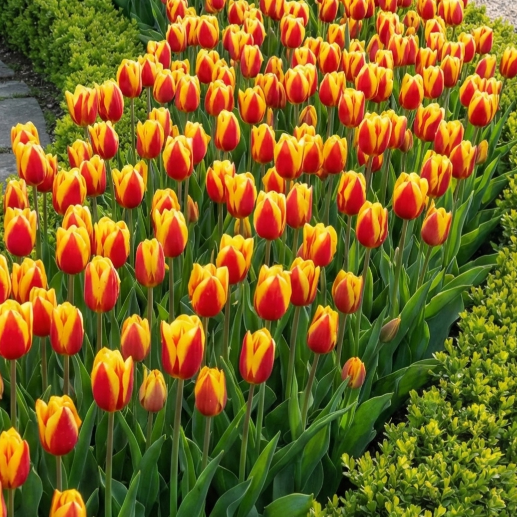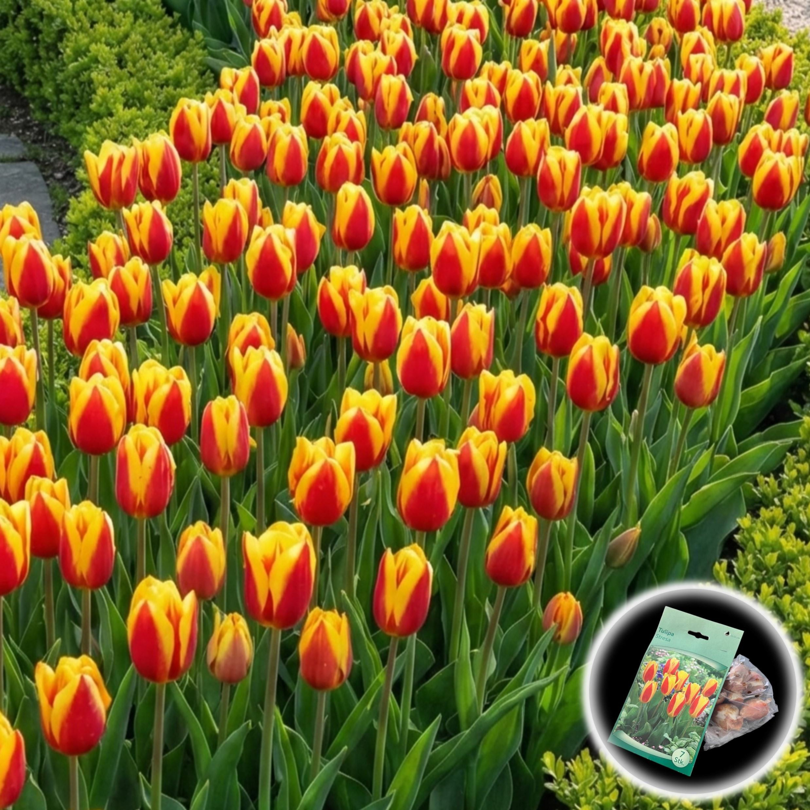 Stresa este o lalea botanică clasică, premiată, care înflorește foarte devreme în primăvară. Se remarcă prin florile bicolore spectaculoase: roșu intens la exterior și galben auriu la interior. Când se deschid la soare, seamănă perfect cu nuferii. Un bonus decorativ îl reprezintă frunzele, care sunt frumos pătate cu dungi maronii-purpurii.