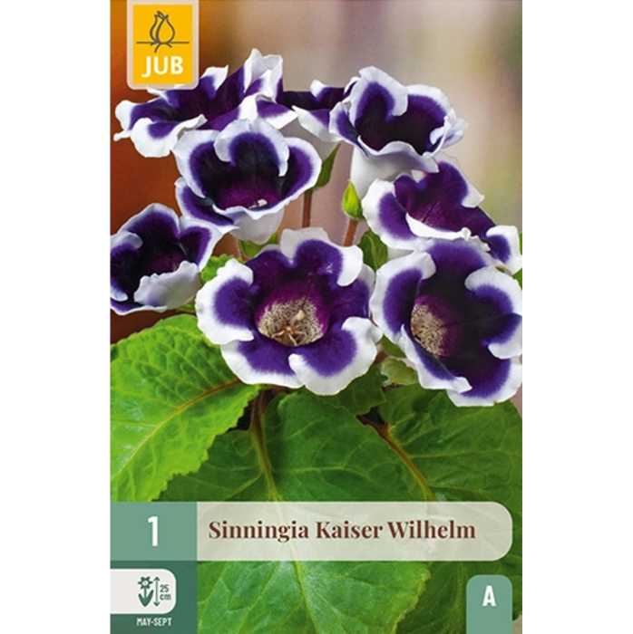 Sinningia Kaiser Wilhelm este o varietate de interior nobila, oferind flori catifelate, de un albastru-violet profund, bordurate elegant cu o margine albă, contrastantă, care îi conferă un aspect regal.