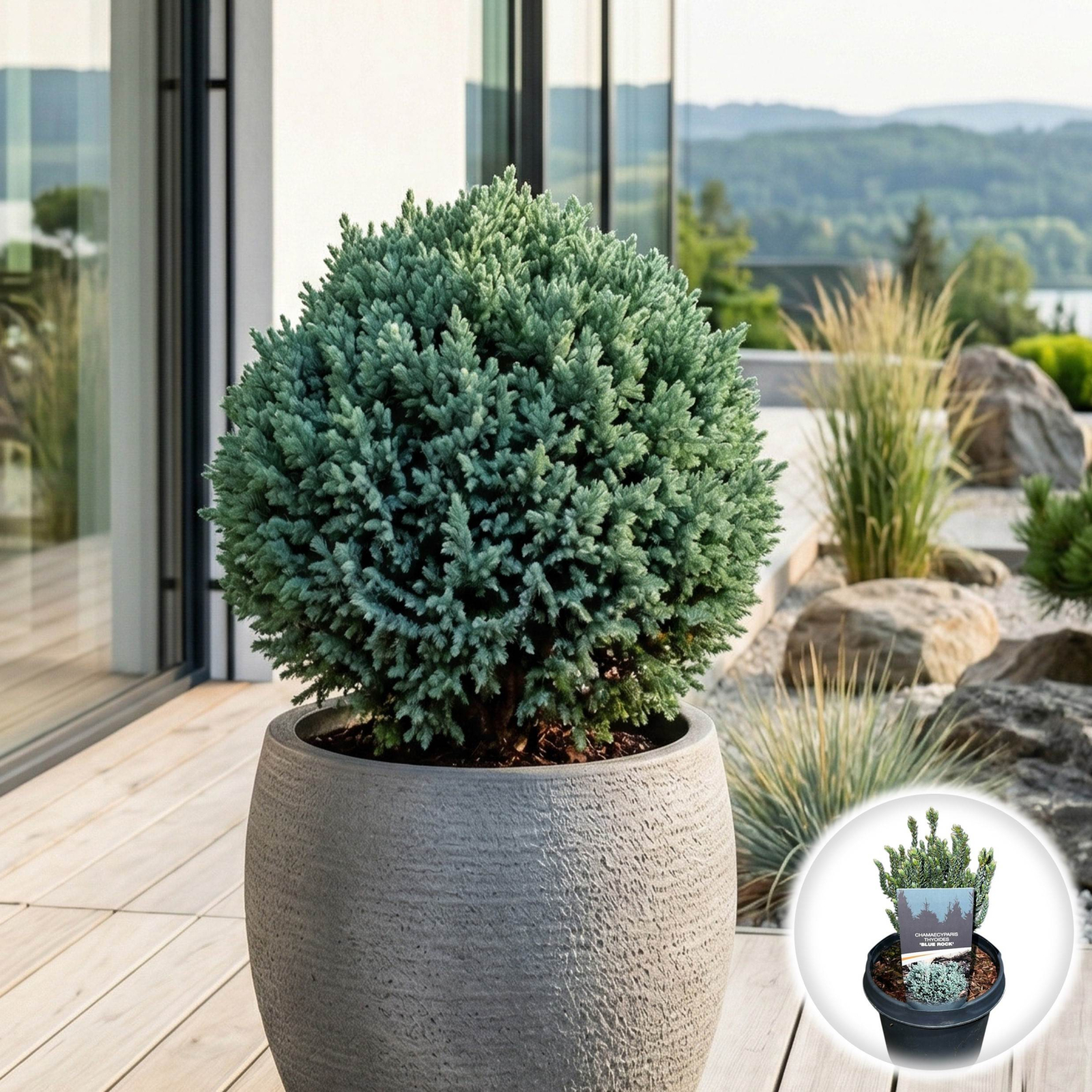 Chiparosul 'Blue Rock' este un conifer pitic ornamental de exterior, extrem de apreciat pentru frunzișul său dens și coloritul unic. Exemplarul de 30 cm are deja o structură bine ramificată. Datorită formei sale compacte și nuanțelor reci, este o alegere excelentă pentru a adăuga textură și un contrast cromatic deosebit în orice amenajare peisagistică, pe tot parcursul anului.