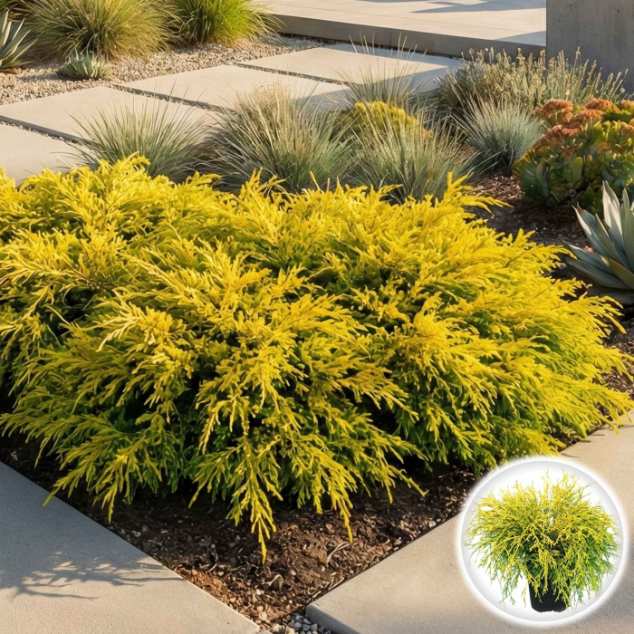 Prezentare: Arbust conifer pitic, formă pletoasă (mounding), foliaj fin auriu-verzui.