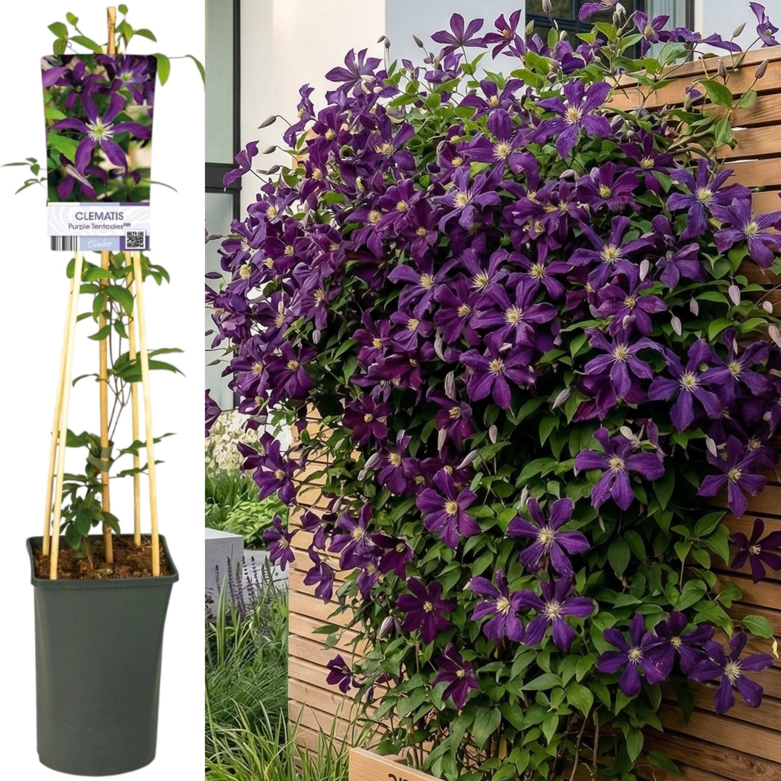 Prezentare: Plantă cățărătoare viguroasă, cu flori complexe de un violet intens și frunziș verde proaspăt.Durata de livrare: 24-48 ore