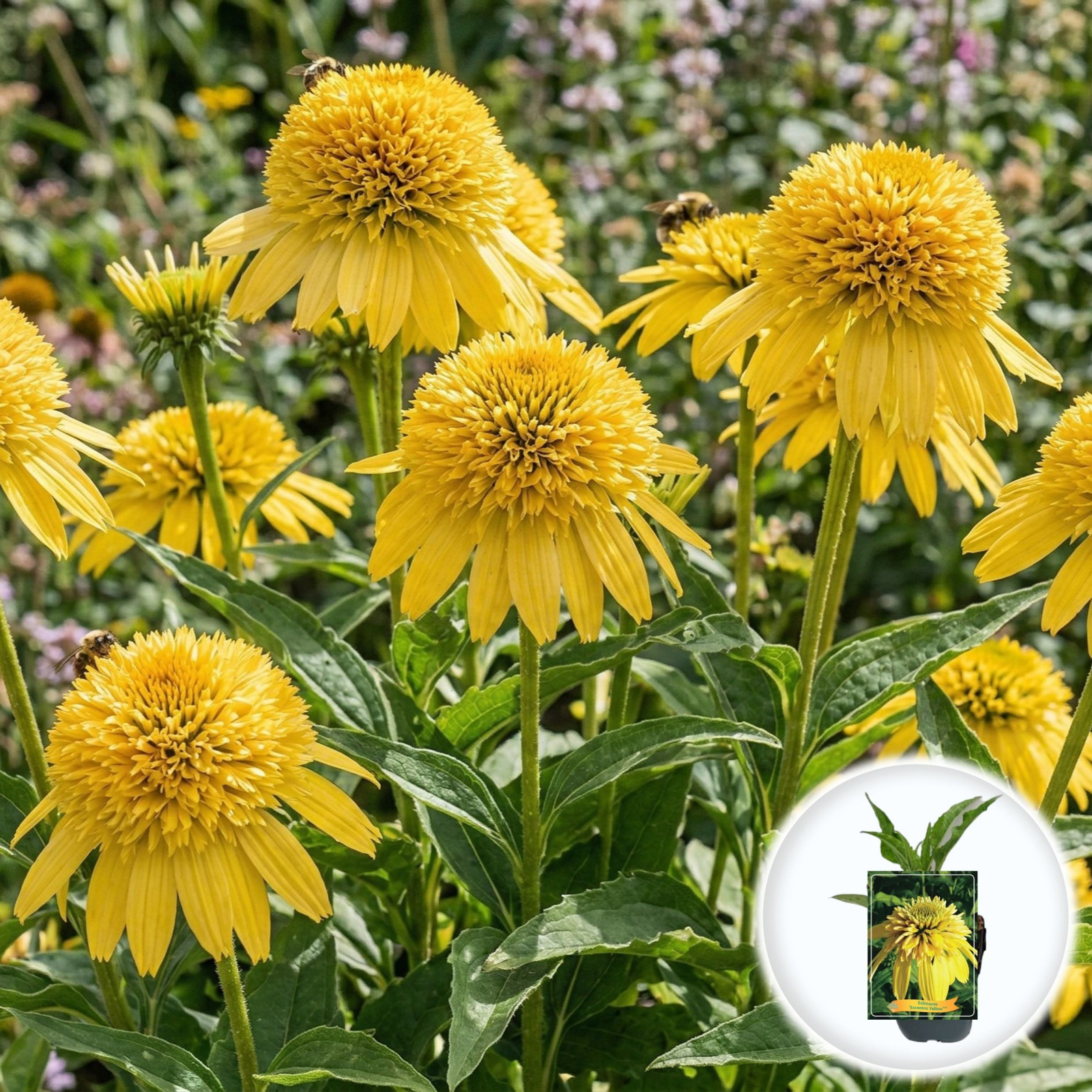 Echinacea 'Eccentric Yellow' este o varietate perenă spectaculoasă, remarcabilă prin florile sale duble, de un galben solar intens, care aduc o textură bogată și o pată de lumină oricărui decor exterior. Originară din preriile Americii de Nord, această plantă robustă este extrem de apreciată în peisagistică pentru capacitatea sa de a atrage polenizatorii și pentru rezistența deosebită în grădinile însorite, fiind ideală pentru borduri mixte sau grădini rustice.