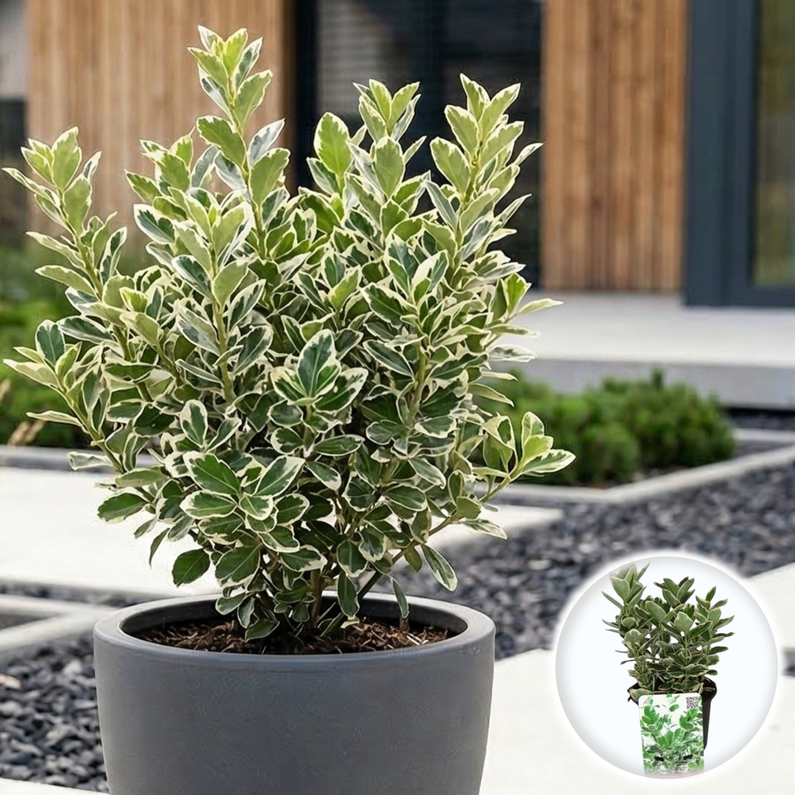 Euonymus japonicus 'Kathy' este un arbust ornamental de o eleganță aparte, remarcabil prin frunzișul său persistent, mare și lucios, de un verde închis tivit cu o margine albă, curată, care oferă un aspect luxuriant oricărui spațiu.