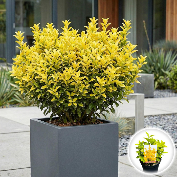 Prezentare: Arbust compact, dens, cu frunze persistente, pieloase, predominant galben-aurii, cu o ușoară tentă verzuie spre centrul frunzei la maturitate.