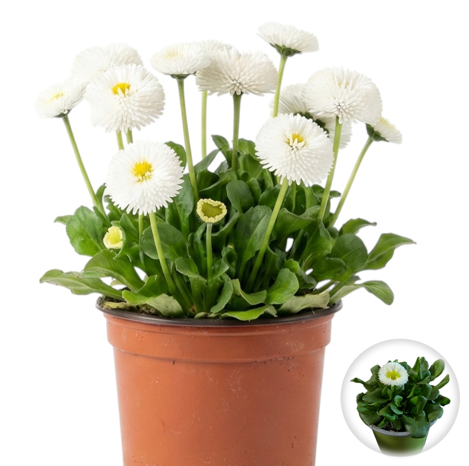 Bellis Alb este simbolul purității de primăvară, oferind inflorescențe sferice de un alb imaculat, care contrastează superb cu frunzișul verde crud.