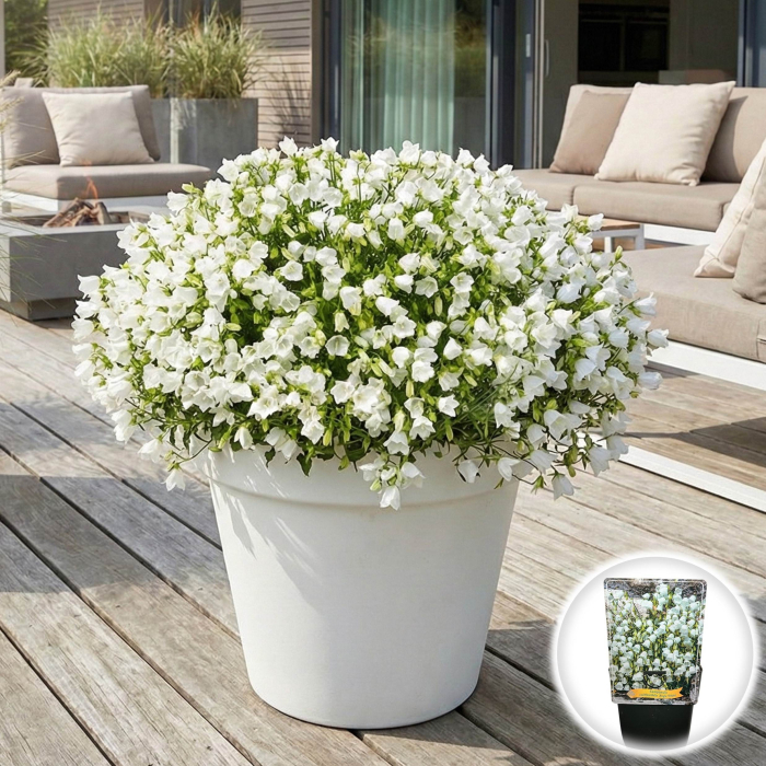 Campanula 'Jingle White' este o plantă perenă delicată, de talie mică, destinată mediului exterior. Este una dintre cele mai îndrăgite plante pentru acoperirea solului sau pentru decorarea grădinilor alpine, fiind apreciată pentru abundența florilor sale ce seamănă cu niște mici clopoței atârnați, care aduc o notă de prospețime și luminozitate oricărui colț de grădină.