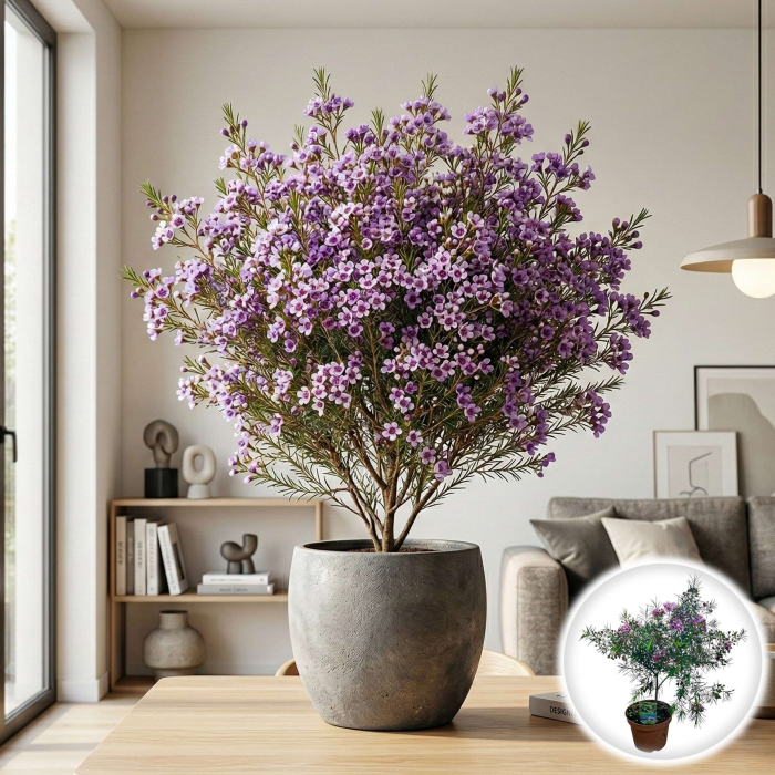 Cunoscută sub numele popular de "Floarea de Ceară" sau "Waxflower", acest arbust veșnic verde este o adevărată încântare pentru simțuri. Florile sale mici, delicate, cu aspect cerat (de unde și numele), rezistă săptămâni întregi, fiind preferatele floriștilor din întreaga lume. Pe lângă frumusețea vizuală, frunzișul său fin, asemănător acelor de pin, emană un parfum proaspăt, citric-condimentat, la cea mai fină atingere, transformând planta într-un odorizant natural pentru terase și balcoane luminoase.