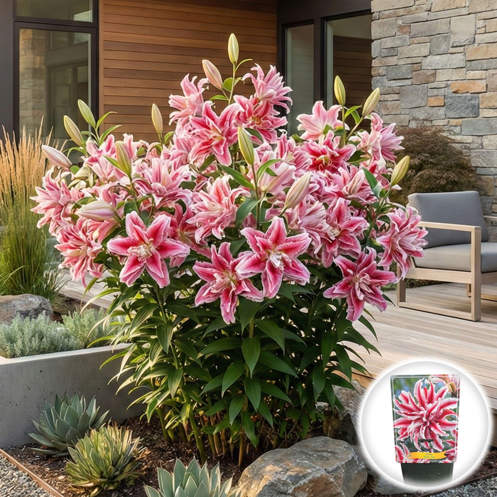 O adevărată stea a grădinii, Magic Star este un crin oriental dublu, rar și spectaculos, care impresionează prin exotismul său. Florile sale sunt mari, "bătute" (fără polen, deci nu pătează hainele!), având multiple rânduri de petale roz-bonbon, decorate cu o dungă centrală roșie și pistrui delicați. Emană un parfum dulce, intens, fiind piesa de rezistență în orice aranjament floral sau bordură însorită.