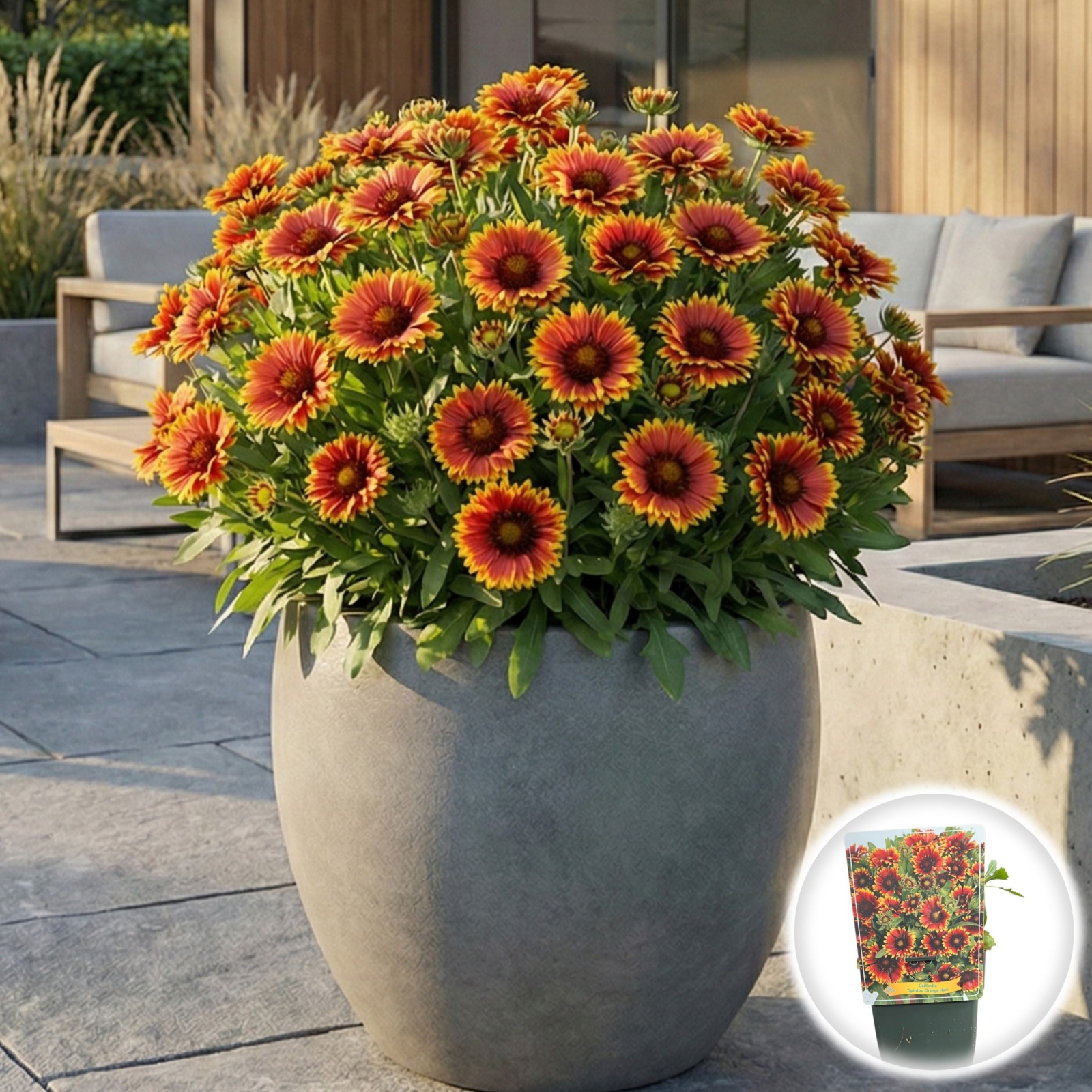 O explozie de energie solară în grădina dumneavoastră! Gaillardia Spintop Orange Halo impresionează prin florile sale mari, plate, de un roșu-portocaliu intens, înconjurate de un inel (halo) galben-auriu la vârfurile petalelor. Este o plantă perenă compactă, extrem de floriferă, care transformă orice bordură sau jardinieră într-un spectacol de culoare din vară până la primele înghețuri. Originară din selecții olandeze moderne, este campioană la rezistența la secetă.