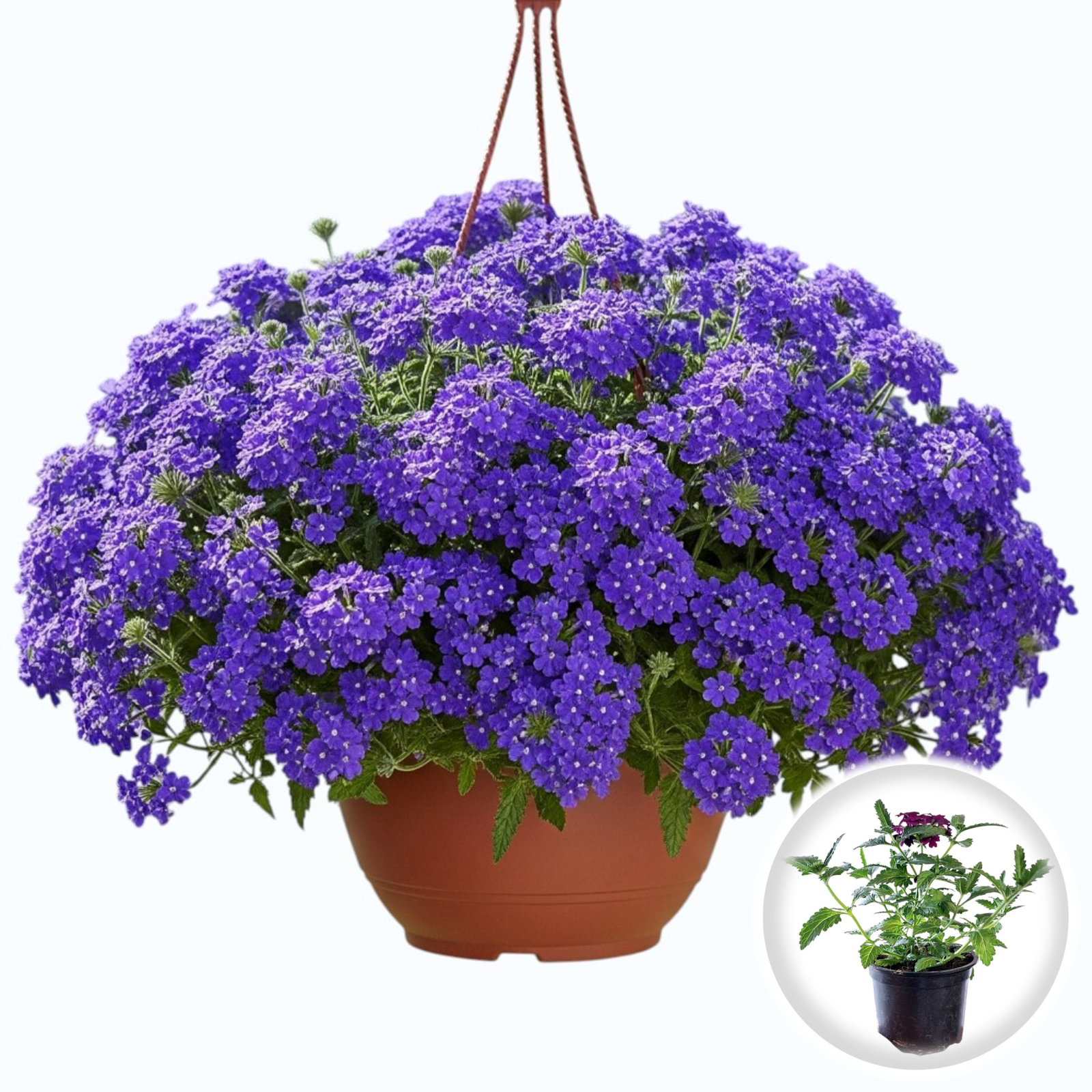 Verbena curgătoare Albastră este una dintre cele mai rezistente și spectaculoase plante pentru decorul de vară, oferind cascade de flori mărunte, grupate în inflorescențe globulare de un albastru-violet intens.
