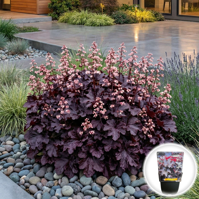 Heuchera 'Palace Purple' este o plantă perenă de exterior extrem de versatilă, premiată pentru frumusețea sa arhitecturală. Este recunoscută pentru frunzele sale lucioase, cu aspect metalic, care aduc o pată de culoare închisă și elegantă în orice colț al grădinii, contrastând superb cu plantele cu frunziș verde deschis sau auriu.