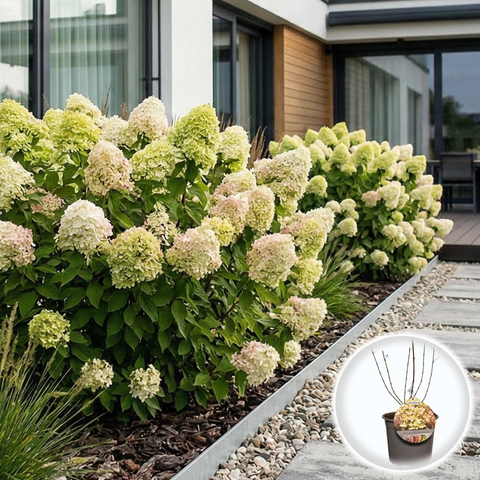 Hydrangea paniculata 'PastelGreen' este o varietate inovatoare și premiată, adorată pentru spectacolul cromatic unic al florilor sale care își schimbă nuanțele de la alb-crem și fistic, la roz pal și verde mentă pe parcursul sezonului.