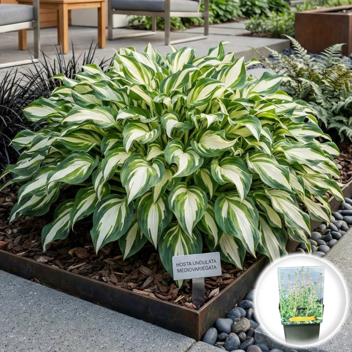 Hosta undulata 'Mediovariegata' este o plantă perenă clasică de exterior, extrem de apreciată pentru frumusețea frunzișului său bicolor și textura ușor ondulată. Livrată sub formă de plantă deja înrădăcinată, se va prinde rapid și va oferi un accent luminos și elegant în zonele umbrite ale grădinii tale.