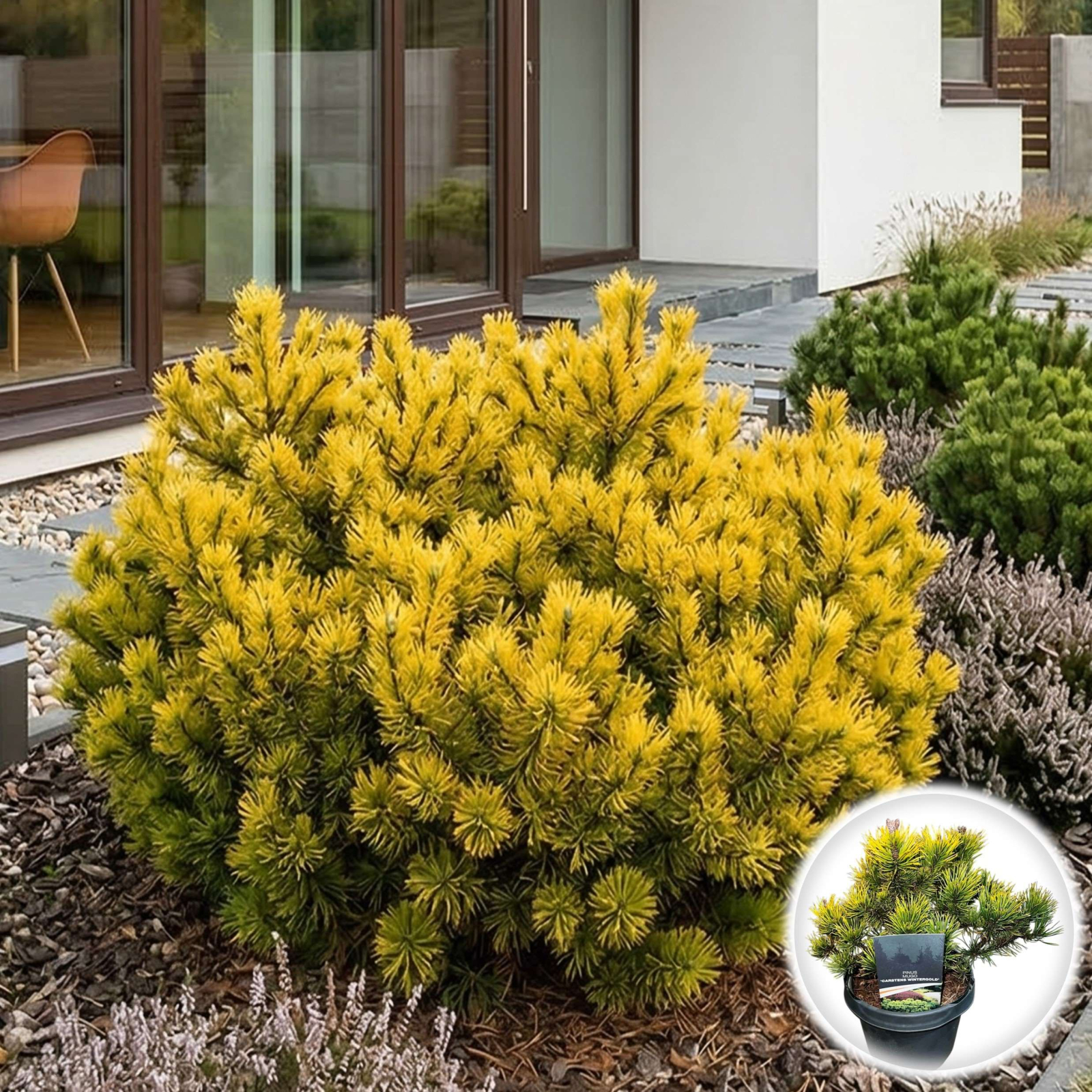 Pinus mugo 'Carstens Wintergold' este un conifer pitic decorativ excepțional, renumit pentru transformarea sa cromatică spectaculoasă: frunzișul verde crud din timpul verii capătă o nuanță aurie vibrantă, luminoasă, pe parcursul iernii. Originar din zonele montane europene, acest soi aduce o textură deosebită și un contrast cromatic valoros în sezonul rece, fiind ideal pentru stâncării, grădini alpine, borduri sau cultivat în jardiniere spațioase pe terase.