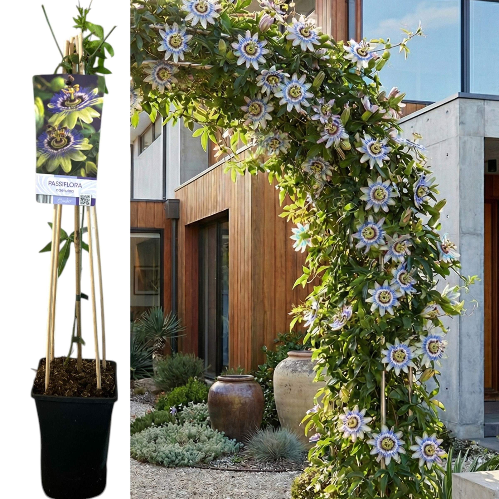 Passiflora Caerulea este cea mai cunoscută și robustă varietate de Floarea Pasiunii, oferind flori exotice spectaculoase, cu petale alb-crem și o coroană complexă de filamente albastre și albe.