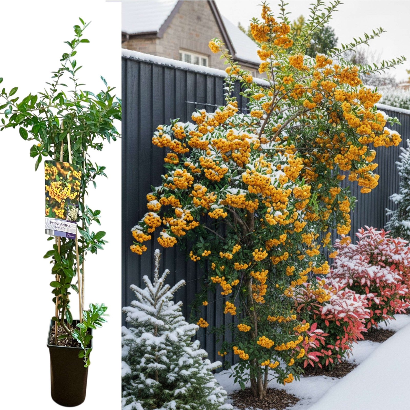 Pyracantha 'Soleil D'Or' este un arbust ornamental viguros, ideal pentru exterior, renumit pentru fructele sale abundente și de culoare vie, care oferă culoare grădinii pe tot parcursul toamnei și iernii. Este un arbust spinător, ceea ce îl face excelent și ca gard viu de protecție.
