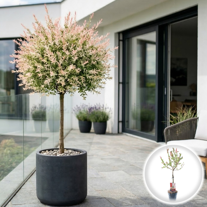 Salix integra 'Hakuro Nishiki' este un arbust ornamental de o frumusețe rară, altoit pe picior, care impresionează prin explozia sa de culori: frunze verzi cu pete albe și vârfuri de un roz pudrat spectaculos.