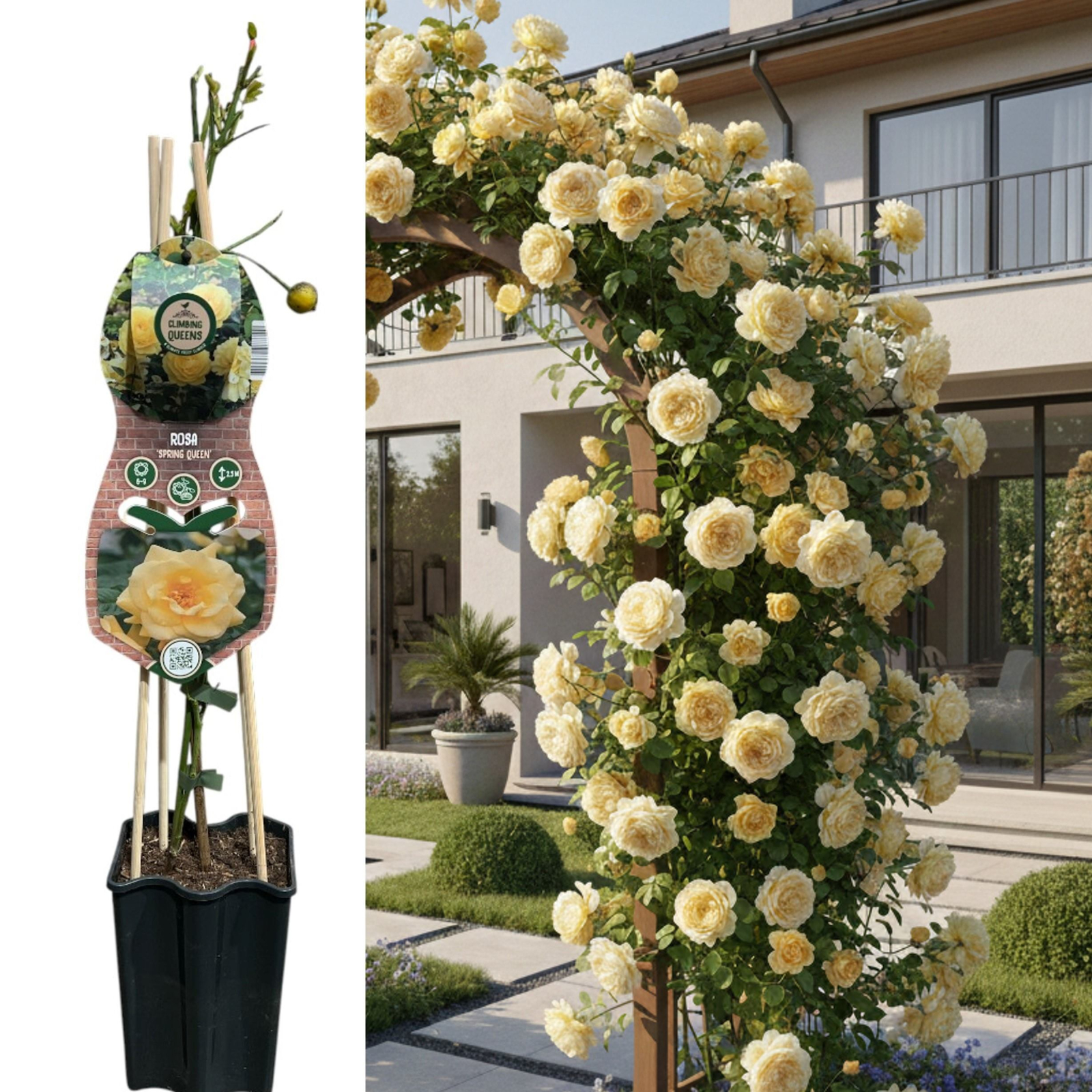"Regina Primăverii" este un trandafir cățărător viguros, care aduce lumina soarelui direct în grădina dumneavoastră. Se remarcă prin explozia de flori galben-aurii, strălucitoare, care îmbracă rapid gardurile, arcadele sau pergolele. Este un soi robust, cu o creștere rapidă și un parfum discret, proaspăt, ideal pentru a crea pereți vegetali plini de viață și culoare.