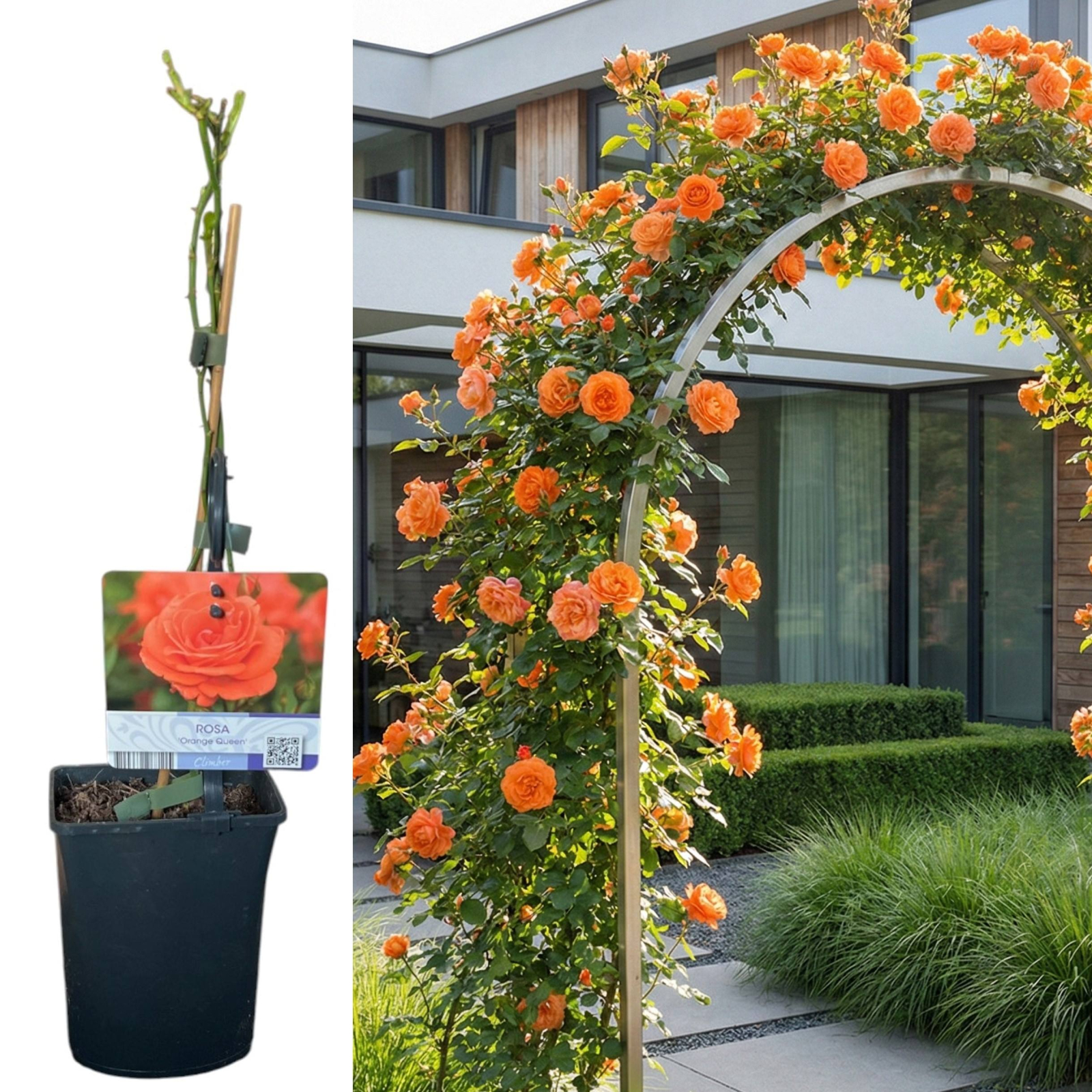 Aduceți energia și căldura focului în grădină cu "Regina Portocalie". Acest trandafir cățărător spectaculos se distinge prin florile sale de un portocaliu vibrant, aprins, care nu se decolorează ușor la soare. Este un soi viguros, capabil să transforme un gard banal sau o pergolă într-un perete de culoare intensă. Originar din Olanda, 'Orange Queen' este alegerea perfectă pentru grădinarii care doresc un accent cromatic puternic și vesel.