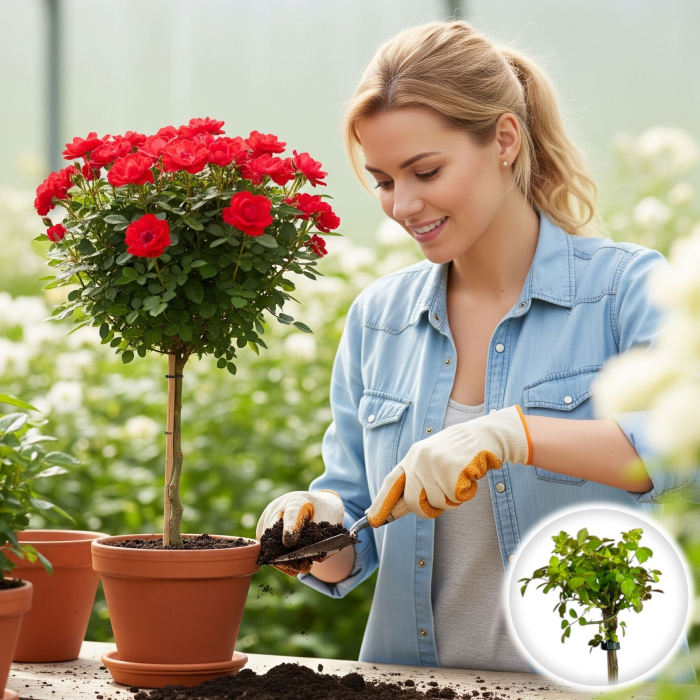 Rosa 'Bright Red' sub formă de pomișor este o piesă centrală deosebită pentru orice grădină de exterior. Această formă de cultură presupune altoirea unei varietăți de trandafir cu înflorire abundentă pe un trunchi înalt și drept, rezultând un aspect de „copăcel de trandafiri”. Este ideal pentru a adăuga verticalitate și eleganță clasică grădinii dumneavoastră.