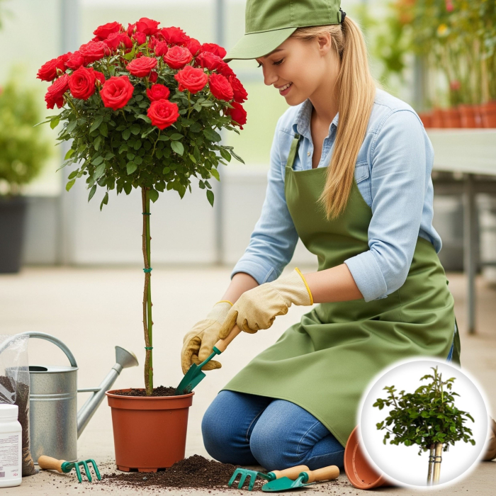 Sfatul specialistului (Pepiniera Sibiu): Trandafirii pomișor au neapărată nevoie de un tutore (un par de susținere) imediat după plantare. Trunchiul, deși pare lemnificat, nu poate susține singur greutatea coroanei pline de flori în timpul vânturilor puternice. Legați trunchiul de tutore în două locuri (sub altoi și la mijloc) cu un material care nu rănește scoarța. Iarna, punctul de altoire (zona de unde pornesc crengile coroanei) trebuie protejat de ger prin învelire cu sac de iută sau material agrotextil (husa de protecție).